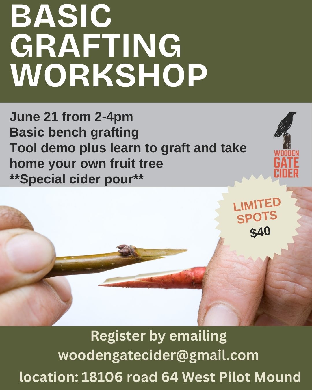 June 21 from 2pm - 4pm Come learn bench grafting, tool demo and graft and take home your own fruit tree
