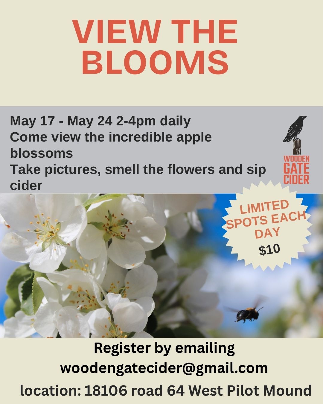 May 17th through May 24th from 2-4pm you can come take pictures, smell the flowers and sip cider